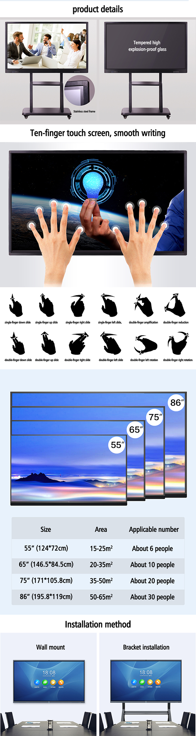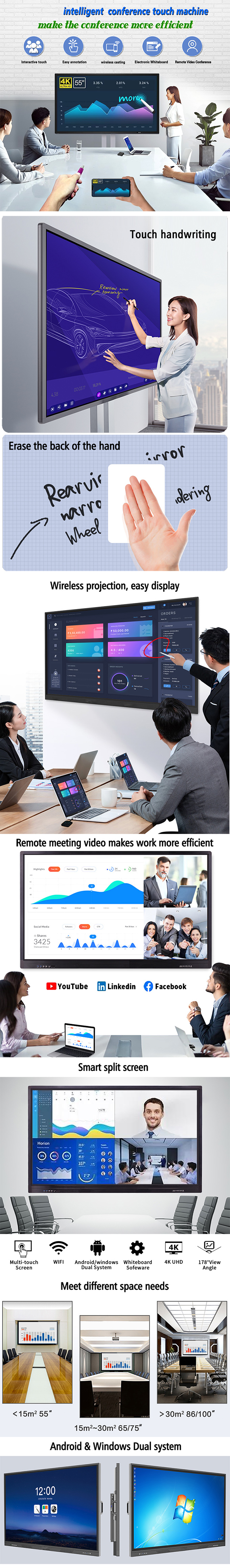 The interactive conference machine uses an ultra high-definition LCD screen as the display and operation platform, with functions such as writing, annotation, synchronous interaction, multimedia, and remote video conferencing. It integrates high-definition display, human-computer interaction, multimedia information processing and network transmission and other technologies. Through a variety of innovative solutions based on this product that integrate the latest IT technology, it greatly improves people's communication efficiency in conferences, presentations, industry commands, deployments and other applications. It is the preferred solution for office, teaching, and graphic interactive presentations in the information age plan.